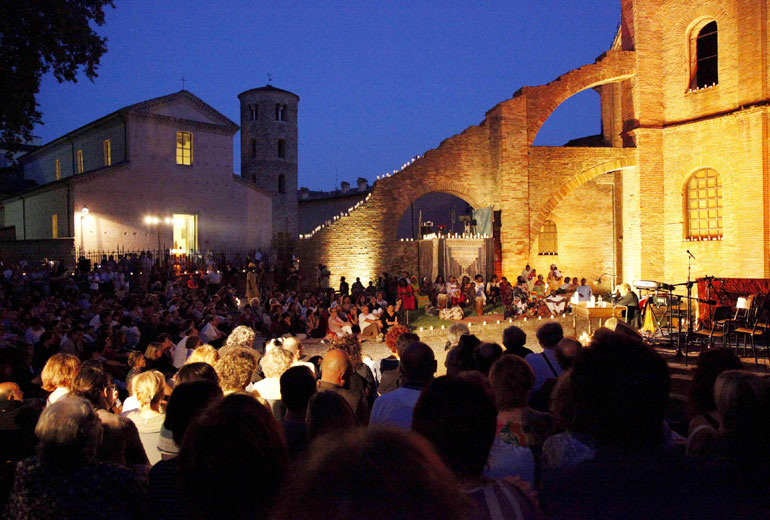 Founded in 1990 by Cristina Mazzavillani Muti, Ravenna Festival has always been characterized by an artistic programme including all types of performing arts: symphonic and chamber music, opera, drama, dance, ballet, musical theatre, jazz, and ethnic music. Every year between June and July, the entire city becomes a stage for two months: its staggering gilded basilicas, encrusted with ancient mosaics, its elegant historical theatres, its cloisters, ancient buildings, the industrial heritage sites, but also its beaches and its pine forest, where Dante was hosted, and further off, the gently rolling hills peeping from the distant horizon…