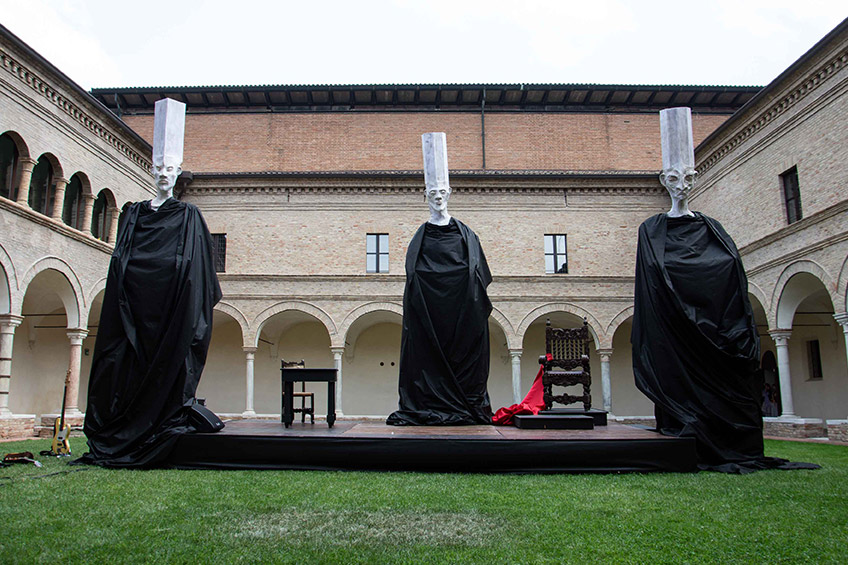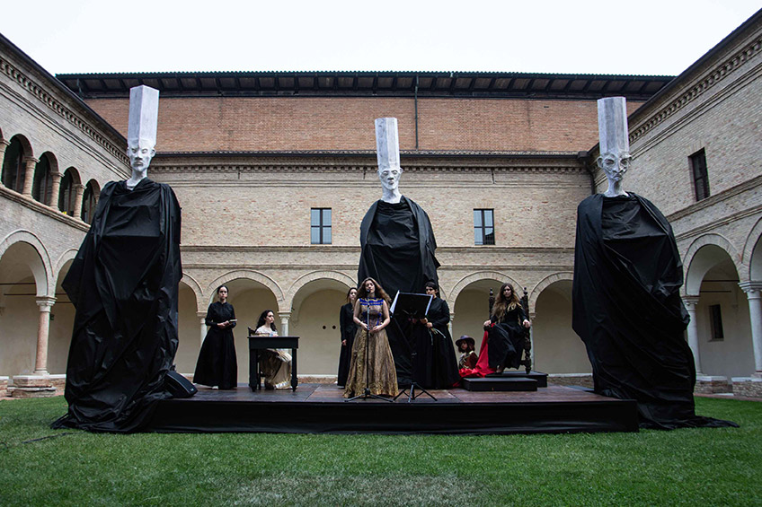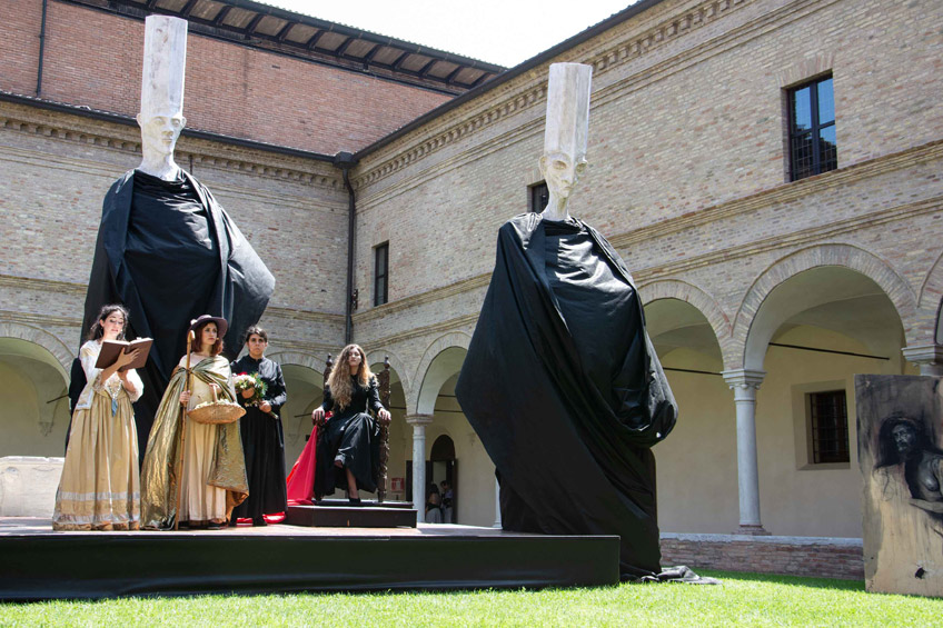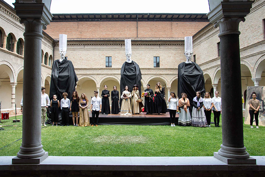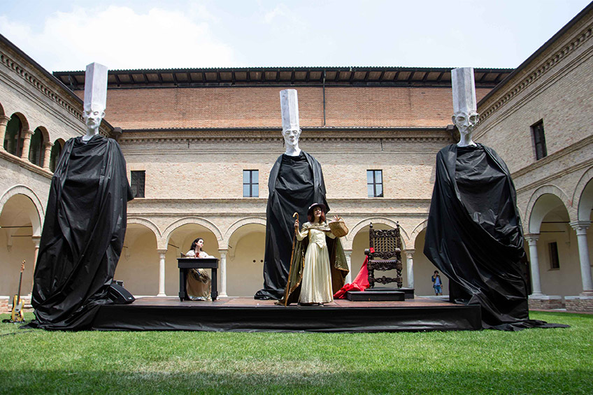 Di fronte allo spettatore si alternano momenti propriamente drammaturgici con altri musicali e di performance artistica, mentre l’elemento scenografico è mirato a valorizzare l’architettura del Chiostro, inserendo elementi simbolici che con esso costituiscono uno sfondo unitario e armonico.
