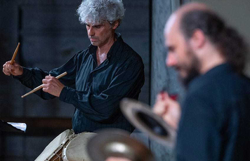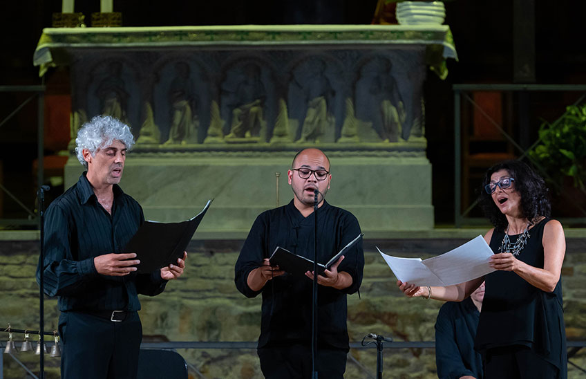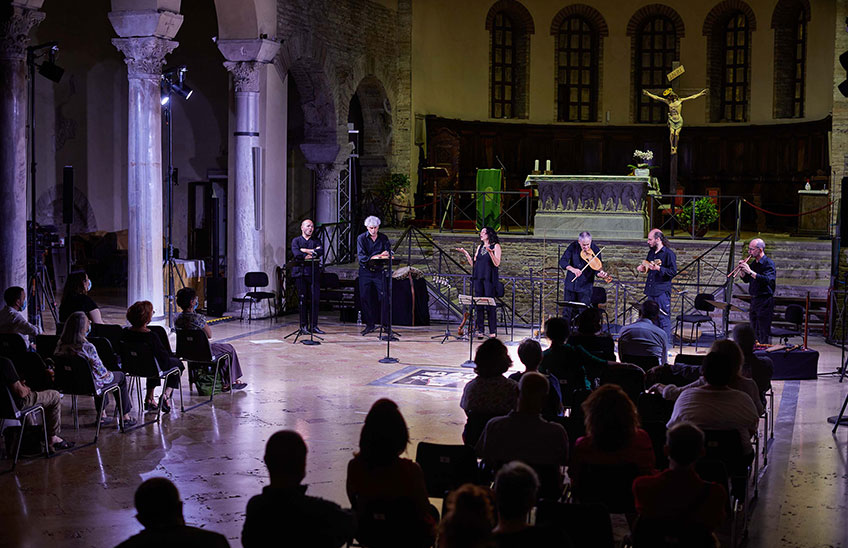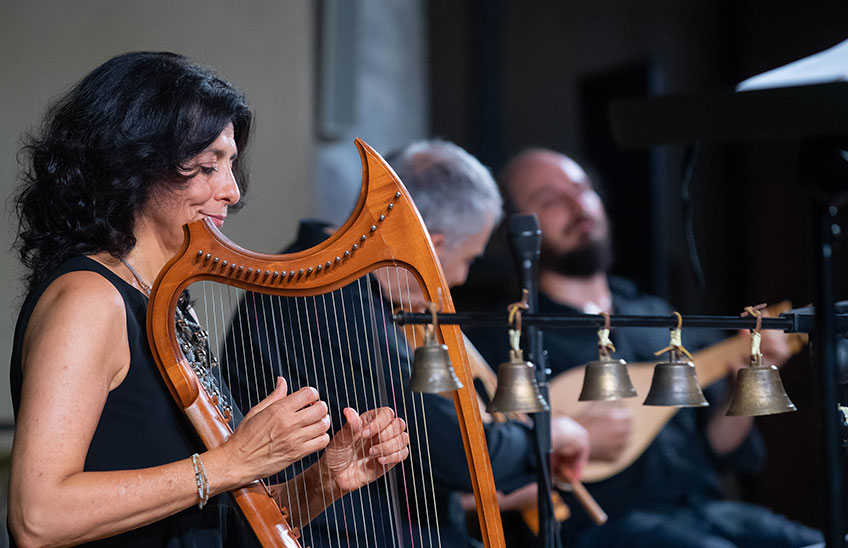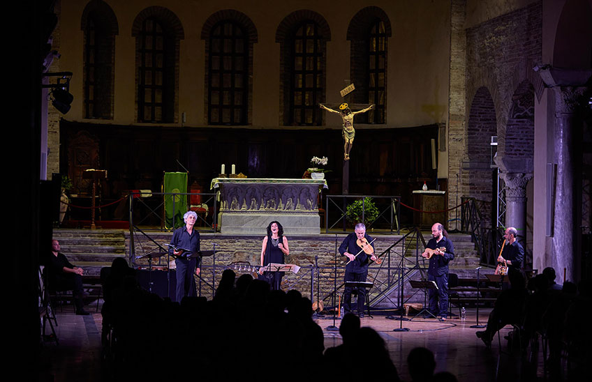 È un viaggio che parte da lontano, quello dell’Ensemble Micrologus, ma che conduce fino al cuore della Commedia. Un viaggio lungo il quale ritrovano nuova vita le sonorità del Medioevo, intrecciando il più rigoroso studio dei manoscritti antichi con l’attenzione per la musica popolare e per le fonti iconografiche coeve. Si susseguono allora i canti devozionali del Laudario di Cortona, ma anche la danza e la poesia amorosa di trovatori come Arnault Daniel, che Dante incontra nel Purgatorio, Bernart de Ventadorn e Marcabru. Passando poi per i timbri di trombe, campane, tamburi e cennamelle, evocati nell’Inferno, si approda all’intonazione di testi menzionati dal Poeta – tra tutti il celebre “Amor che ne la mente mi ragiona” – e ai canti di lode che risuonano nel Paradiso. Per tornare, infine, sulla terra, con i madrigali e le ballate che a Verona animavano la corte scaligera che ospitò Dante.