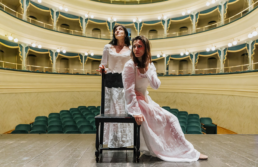 Alla storia narrata dai documenti si affianca una drammaturgia parallela che intreccia improvvise apparizioni di fantasmi, autobiografia, sogno, racconto… le due regine finalmente si incontrano, in nome di una visione del potere diversa da quella “maschile”, imparata dai loro padri, e che forse, chissà, in futuro porterà alla pace.