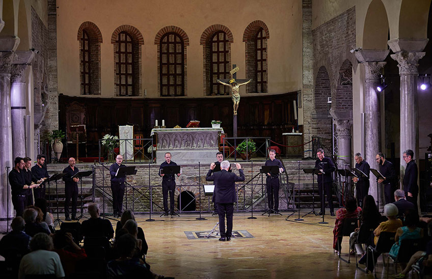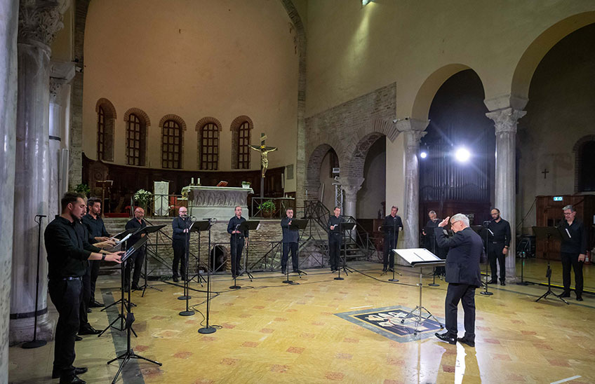 Dodici voci maschili danno veste musicale alla poesia di Dante nella composizione di Mirco De Stefani sul canto XXXIII del Paradiso, quello nel quale trova conclusione e compimento il viaggio ultraterreno della Divina Commedia. Il lavoro è nato nel 2018 per i 750 anni del Chiostro dell’Abbazia di Santa Maria di Follina; destinatario, l’Ensemble Odhecaton che lo interpreterà anche a Ravenna. La partitura procede senza interruzioni lungo le trentatré stanze del testo poetico, e lo fa dispiegando una variegata serie di procedimenti compositivi: polifonie, contrappunti, canoni, imitazioni, unisoni, movimenti a specchio, a spirale, ritmi binari e ternari, cadenze e riprese. Forme e strutture che, nel suono delle voci, trasmettono le parole di Dante con tutta la loro straordinaria carica evocativa.