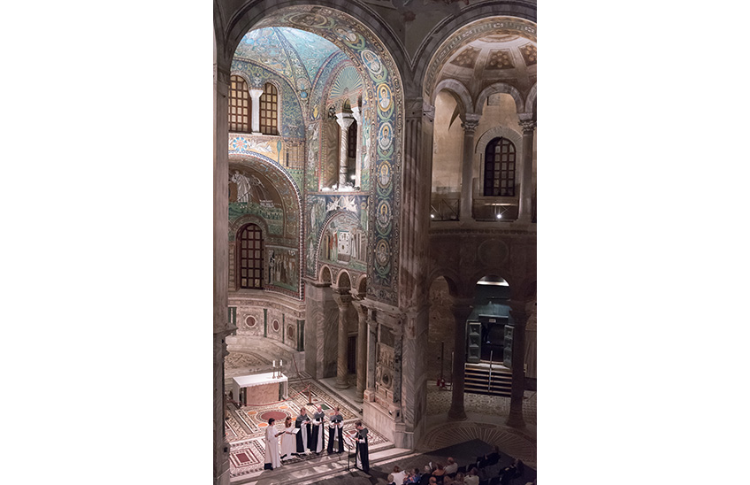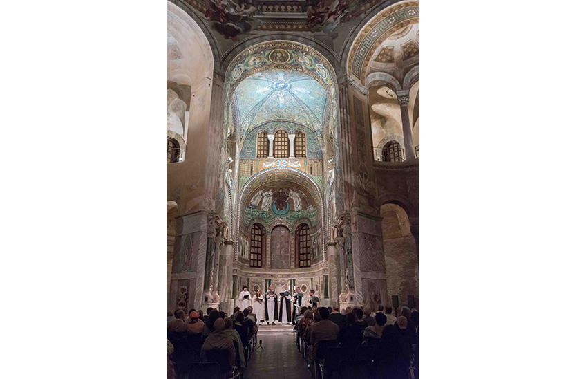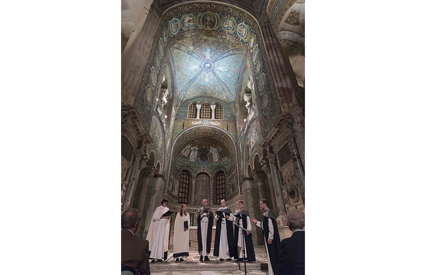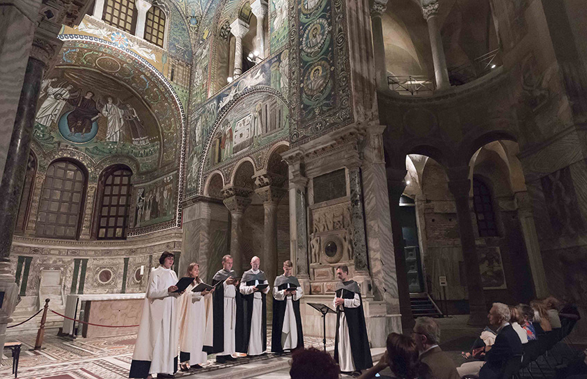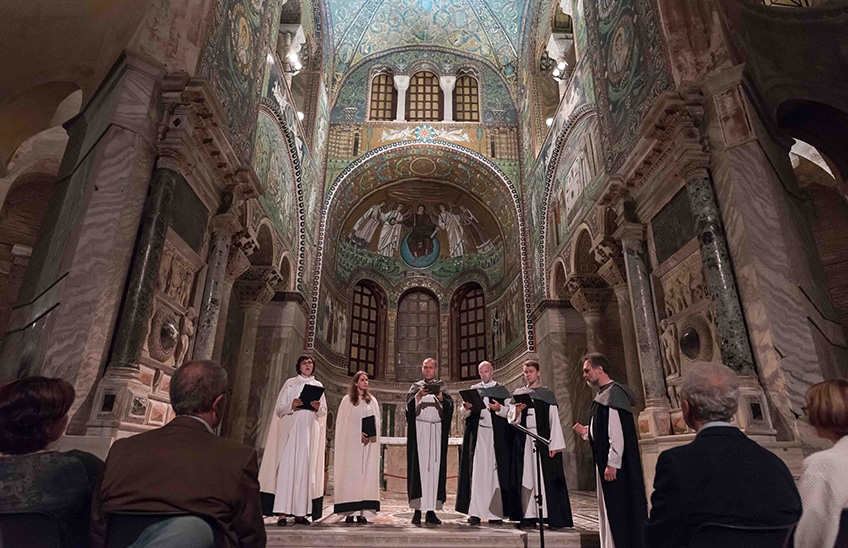 Le liturgie domenicali, come sempre nello splendore delle basiliche ravennati, antico cuore pulsante della città, si concentrano su alcuni fondamentali autori di quella galassia che ha illuminato la storia della devozione e della fede dei popoli europei. Vi figurano due somme espressioni della scuola franco fiamminga del XV secolo, Guillaume Dufay e Johannes Ockeghem, e colui che lasciò un segno indelebile nello sviluppo della storia della musica determinando il passaggio dal rinascimento al barocco, Claudio Monteverdi. Esempio più ordinario, ma non meno prezioso, della diffusa sapienza compositiva che nutriva le cappelle musicali del ’600 italiano, è quello di Aurelio Signoretti, maestro di cappella della Cattedrale di Reggio Emilia. Per arrivare ai giorni nostri, con un doveroso omaggio a Domenico Bartolucci, a un lustro dalla sua scomparsa.