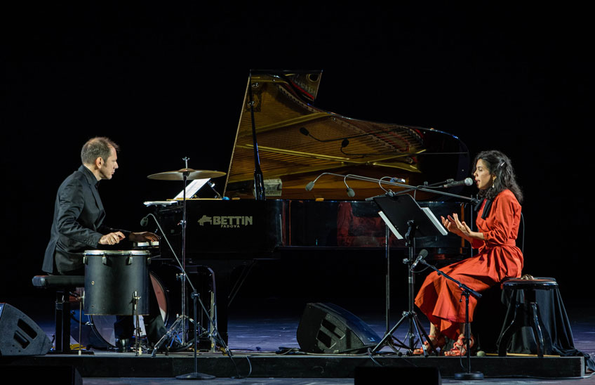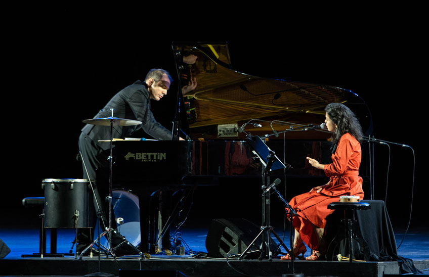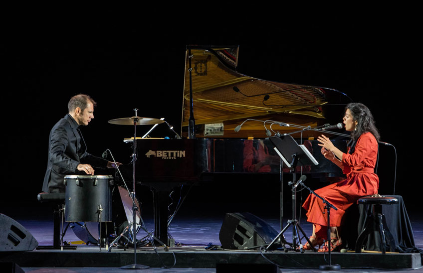 Metti insieme un’attrice da sempre innamorata della musica e un pianista di formazione accademica ma incallito appassionato di arte e teatro, aggiungi poi il gusto per le sfide impossibili: ecco che prende forma questa singolare incursione nella musica greca antica. Sono solo frammenti, apparizioni sonore che ci arrivano da un tempo lontanissimo (dalla fine del V sec. a.C alle soglie del III d.C.), quasi un nucleo musicale, e culturale, originario a cui Lopez e Arevalos attingono per dare nuova linfa alla contemporaneità. Attraverso scelte timbriche spericolate e inedite vibrazioni, ma nel rigoroso rispetto del testo greco, inseguono sonorità dal “sapore” antico, concedendosi una libertà che fa tesoro delle più recenti acquisizioni etnomusicologiche, ampliando lo sguardo a tutto il Mediterraneo fino a Oriente.