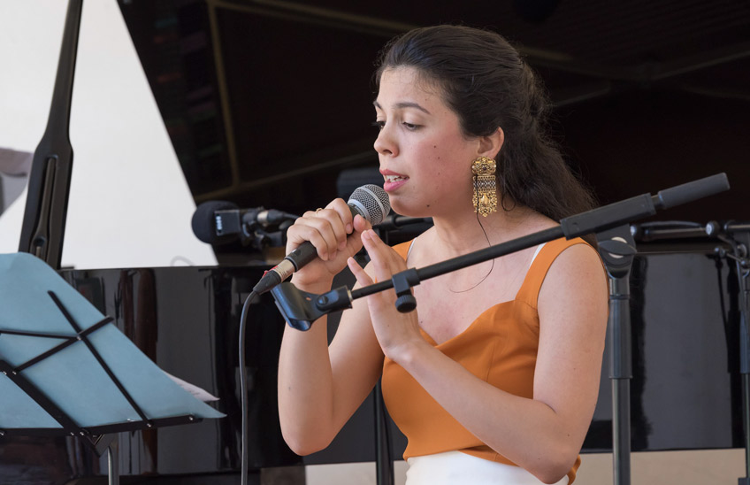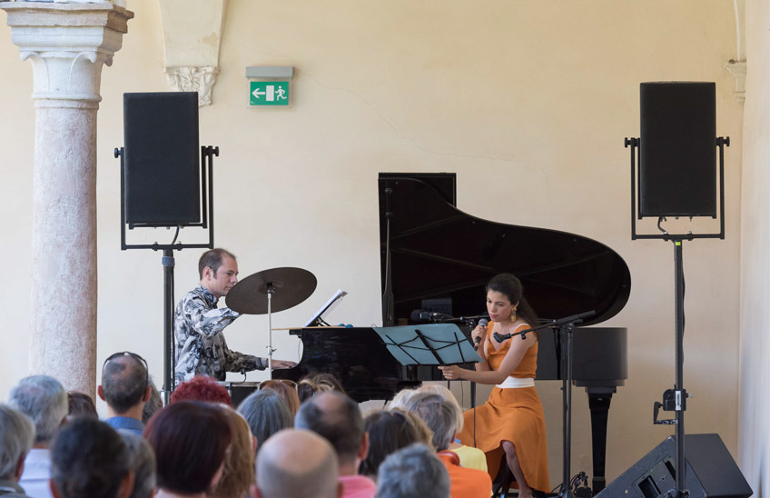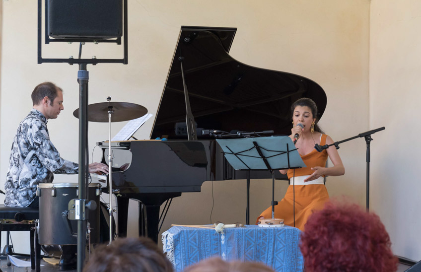 Un’operina che si innesta su uno dei fils rouges del Festival 2019, quello dell’omaggio alla Grecia, orizzonte con cui si confronta tutta la cultura occidentale, Dante non escluso. Se il suo incontro con Ulisse, fra i più affascinanti e simpatetici di tutto l’Inferno, ha offerto il titolo alla XXX edizione, è invece il frammentario patrimonio di melodie greche pervenute fino a noi che ha ispirato Teleion (Τέλειον). Grazie alle traduzioni traslitterazioni di Dimitris Soukoulis, l’attrice-cantante Camilla Lopez e il pianista Matteo Ramon Arevalos esplorano un universo sonoro mitico e pressoché sconosciuto, complici percussioni e un pianoforte preparato: “nella cassa armonica in alcuni casi vengono appoggiati sia uno shruti box che una tanpura, entrambi elettronici, che liberando le corde del pianoforte producono vibrazioni armoniche inusuali – spiega Arevalos – in altri sulle corde si muoveranno palline di vetro o tessere di mosaico bizantino, quasi a rievocare il suono del santur, il cordofono mediorientale; o ancora sarà la stessa interprete a sporgersi sulla cassa armonica, come su un pozzo, facendo risuonare la propria voce nel ventre dello strumento. Inseguendo sempre una sonorità dal sapore antico, vibrazioni contemporanee che rimandano a un’immaginaria antichità”.