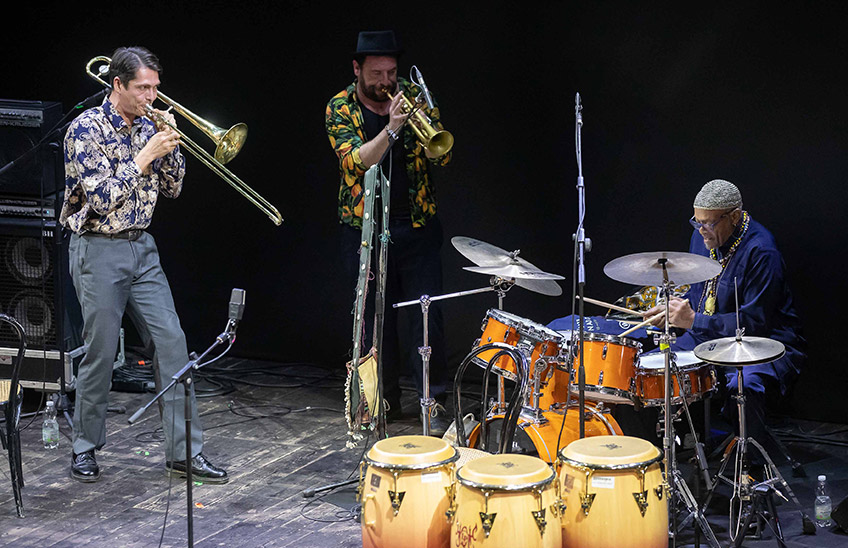 Famodou Don Moye drums e percussioni, Simon Sieger pianoforte e trombone e Christophe Leloil tromba