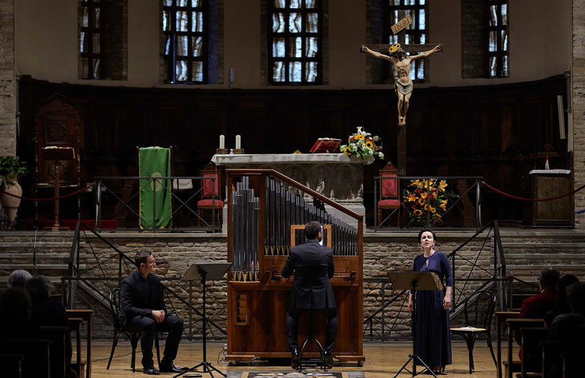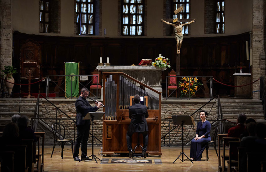 È la tarda mattinata di mercoledì 13 aprile del 1300. Dante descrive l’apparizione di una donna coperta da una nuvola di fiori: per lui è come il sole che talvolta sorge velato da spessi vapori, colorando di rosa l’Oriente e permettendo di fissare lo sguardo sull’astro. La donna indossa un velo bianco e una ghirlanda di ulivo, un mantello verde e una veste color rosso vivo: anche se il Poeta ancora non l’ha vista in volto, il suo spirito ne avverte la potenza d’amore fino a riconoscere in lei la donna amata, Beatrice. È proprio l’incontro con lei, narrato nel canto XXX del Purgatorio, che il trio ripercorre, attraverso l’esecuzione di alcuni mottetti sacri del ‘600 per voce, cornetto e basso continuo, arricchiti di citazioni bibliche tratte dal Cantico dei Cantici, poi dai Vangeli e dai Salmi.